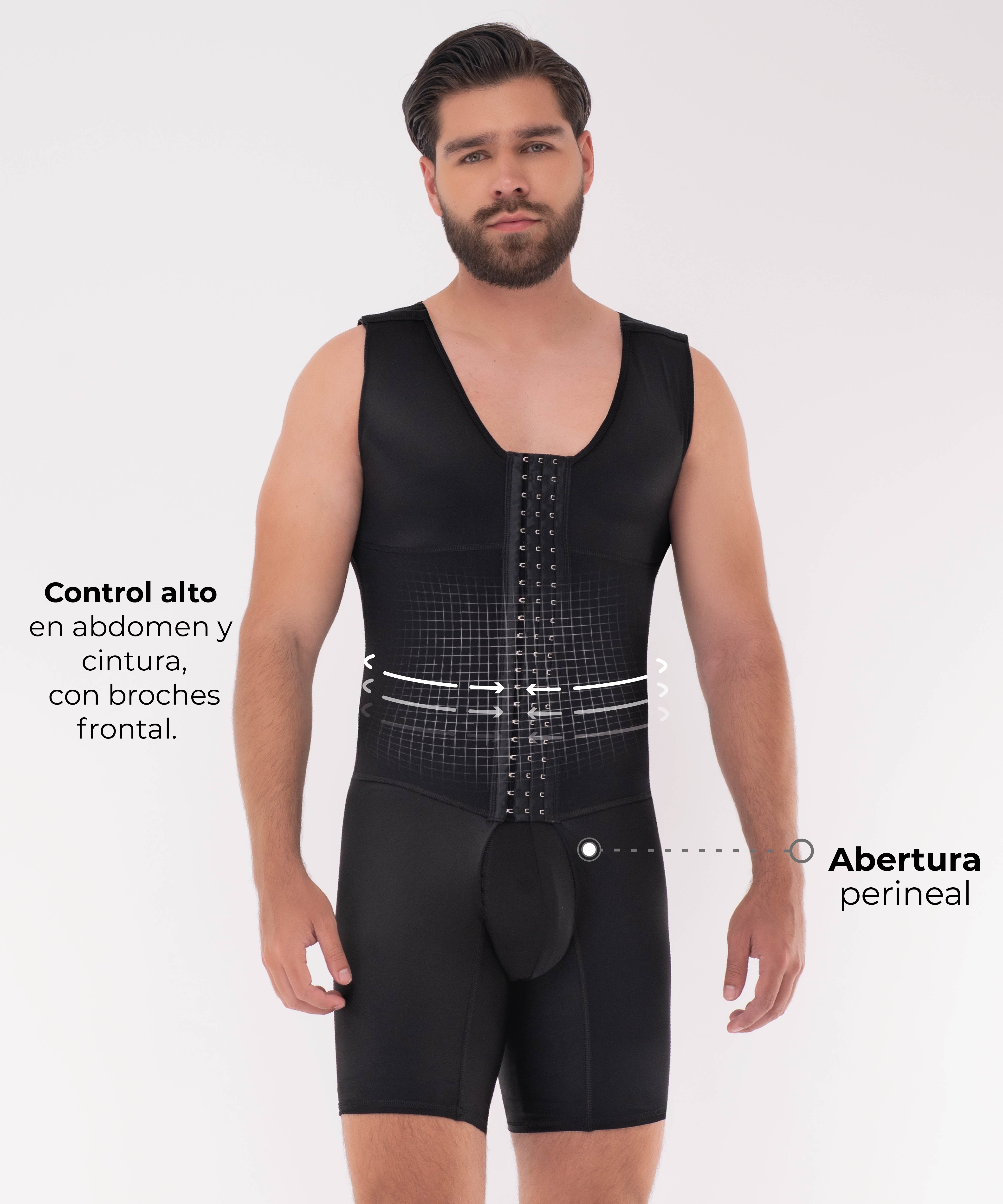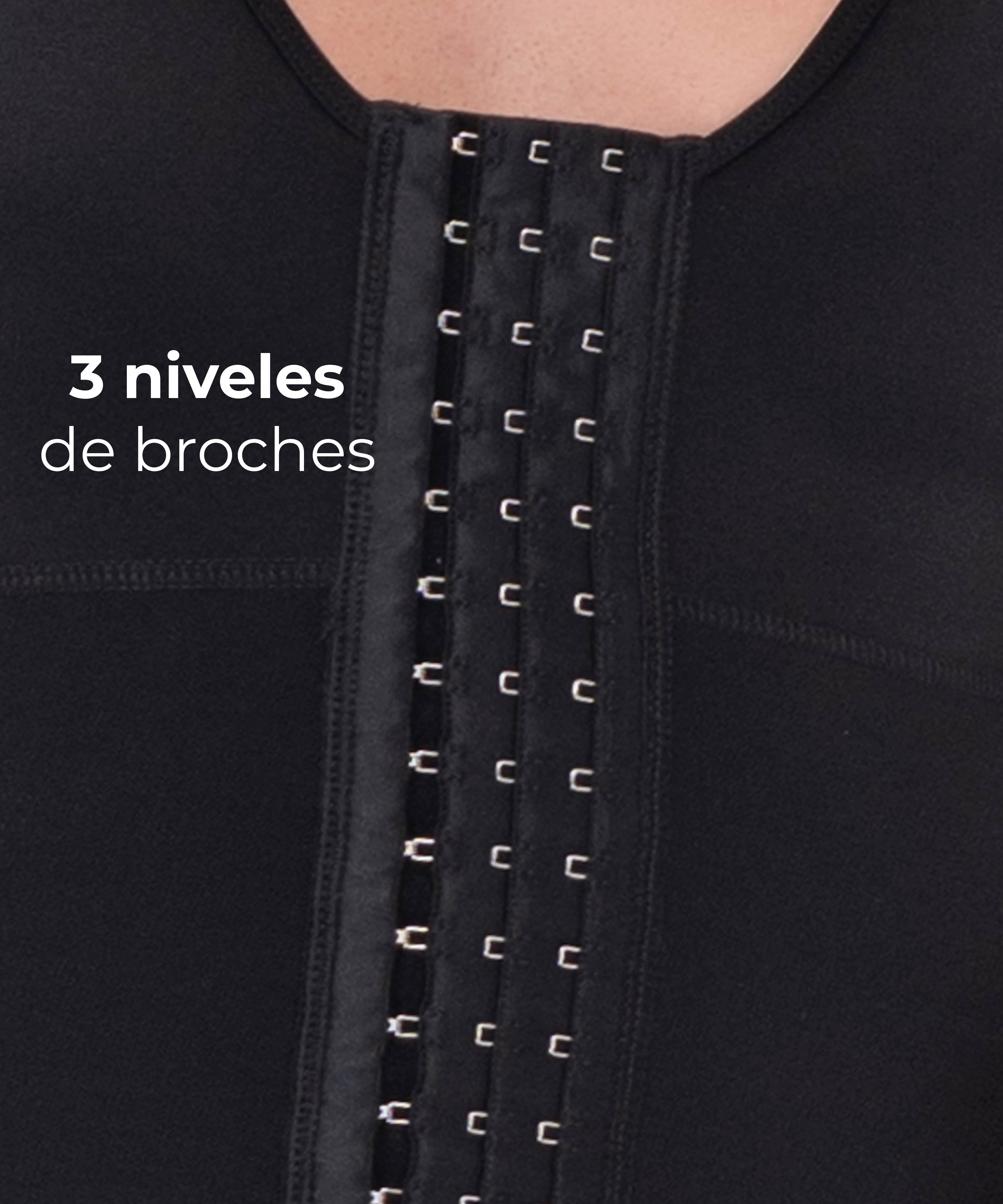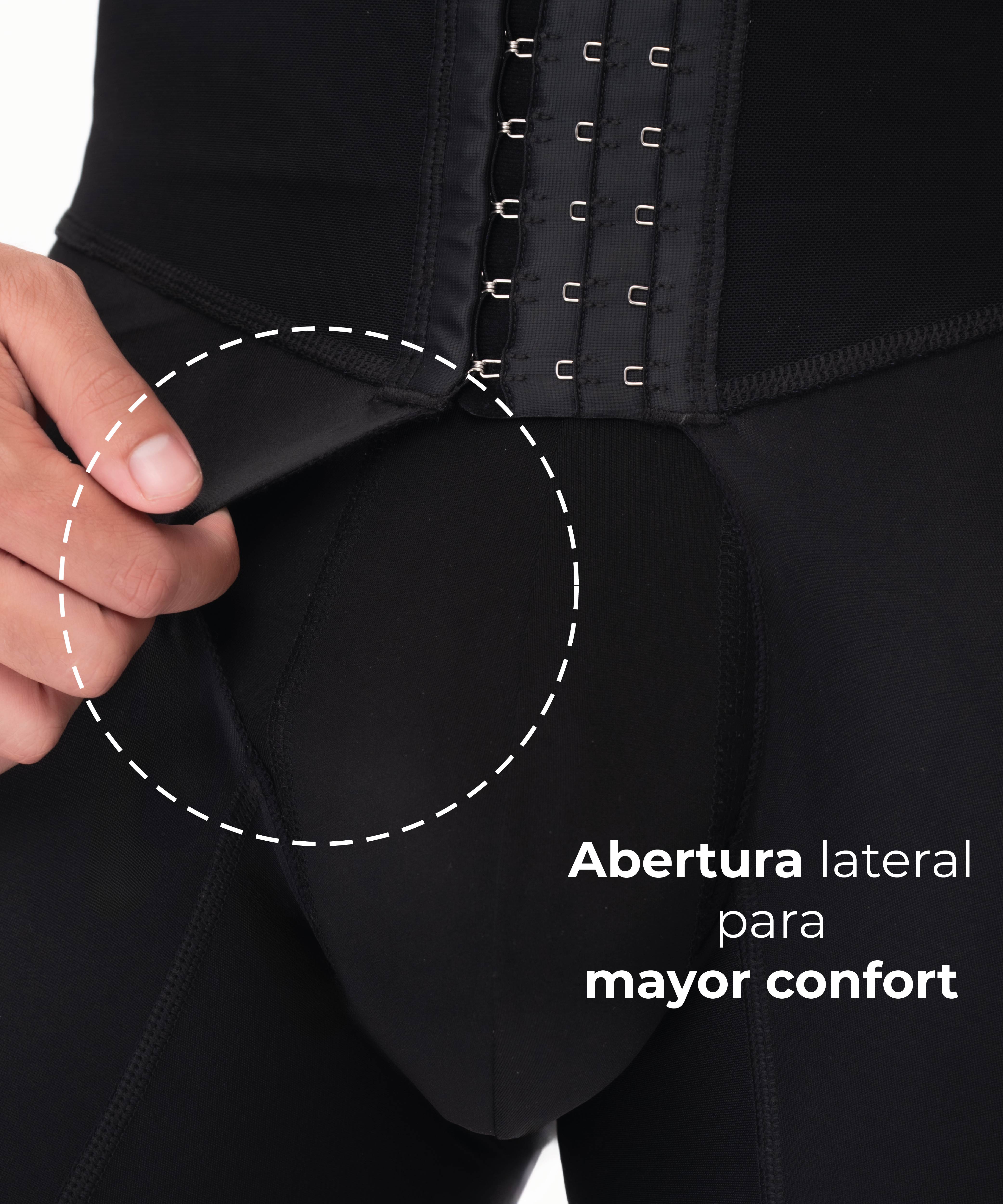 Cuenta con abrochadura frontal de tres niveles, abertura perineal funcional y diseño anatómico de media pierna que moldea glúteos y muslos. Ideal para uso diario, brinda una silueta firme, definida y natural.